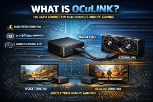OCuLink delivers full PCIe 4.0 ×4 bandwidth (64 Gbps) directly to an external GPU dock with no protocol overhead. USB4 operates at 40 Gbps and must allocate bandwidth between GPU data, display signal and other connected devices simultaneously. In real-world eGPU gaming tests, OCuLink-connected setups consistently outperform USB4 equivalents by 30–40% for GPU-limited workloads. If you plan to add an external RTX 4080 or RTX 4090 in the future, OCuLink is the correct choice. See our Best eGPU Docks guide for compatible hardware.